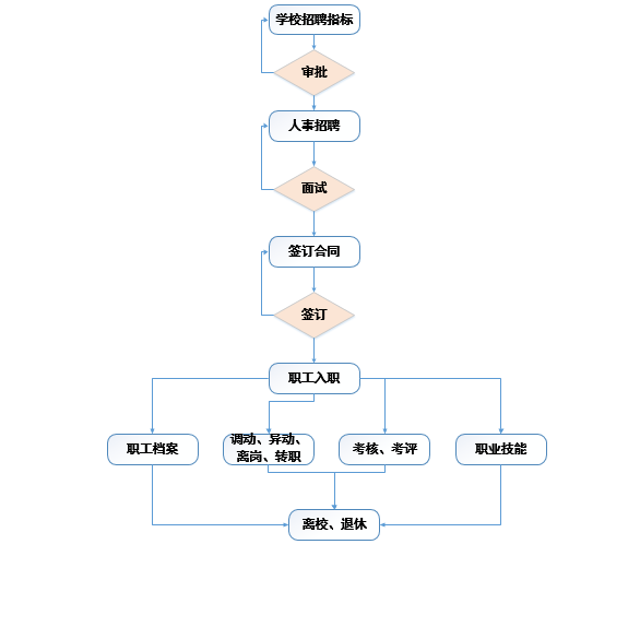 人事部門(mén)處理學(xué)校人事信息,發(fā)布招聘信息到社會(huì )進(jìn)行社招,針對面試可對面試人員進(jìn)行系統登記留存檔案,方便領(lǐng)導審核。完成面試審核針對入校得到教師需要對其進(jìn)行崗前培訓,入校培訓了解其校園文化,校園規則。提交職工提交登記表,針對不同在校的教職工可對其進(jìn)行學(xué)年考核,學(xué)期考核。